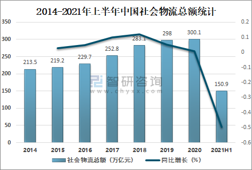 2014-2021年上半年中國社會物流總額統(tǒng)計