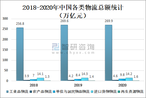 智研咨詢發(fā)布的《2021-2027年中國物流產(chǎn)業(yè)競爭現(xiàn)狀及投資戰(zhàn)略規(guī)劃報告》數(shù)據(jù)顯示:從細(xì)分領(lǐng)域來看,2020年中國工業(yè)品物流總額為269.9萬億元,較2019年增加了0.3萬億元;農(nóng)產(chǎn)品物流總額為4.6萬億元,較2019年增加了0.4萬億元;單位與居民物品物流總額為9.8萬億元,較2019年增加了1.4萬億元;進(jìn)口貨物物流總額為14.2萬億元,較2019年減少了0.1萬億元;再生資源物流總額為1.6萬億元,較2019年增加了0.2萬億元。