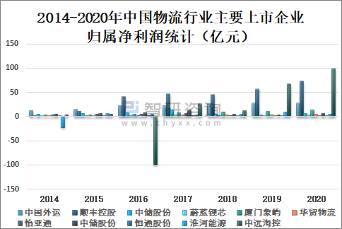 2014-2020年中國物流行業(yè)主要上市企業(yè)歸屬凈利潤統(tǒng)計(億元)