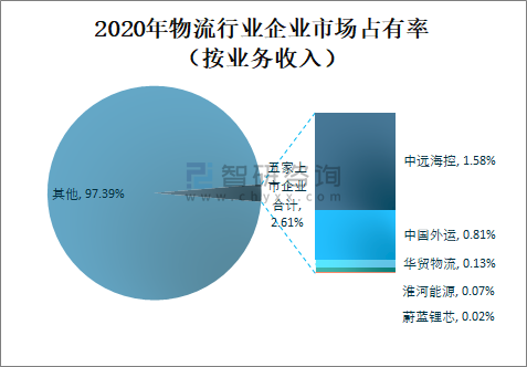 2020年中遠(yuǎn)海控物流業(yè)務(wù)收入占物流業(yè)總收入的1.58%;中國外運(yùn)物流業(yè)務(wù)收入占物流業(yè)總收入的0.81%;華貿(mào)物流物流業(yè)務(wù)收入占物流業(yè)總收入的0.13%;淮河能源物流業(yè)務(wù)收入占物流業(yè)總收入的0.07%;蔚藍(lán)鋰芯物流業(yè)務(wù)收入占物流業(yè)總收入的0.02%。2020年中遠(yuǎn)海控、中國外運(yùn)、華貿(mào)物流、淮河能源和蔚藍(lán)鋰芯五家上市企業(yè)物流業(yè)務(wù)收入總和僅占物流業(yè)總收入的2.61%,企業(yè)市場占有率非常低,市場格局較為分散,市場競爭十分激烈。