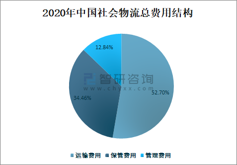 2020年中國社會物流運(yùn)輸費(fèi)用占社會物流總費(fèi)用的52.70%,占比最大;保管費(fèi)用占社會物流總費(fèi)用的34.46%;管理費(fèi)用占社會物流總費(fèi)用的12.84%。