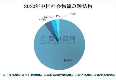 2020年中國工業(yè)品物流總額占社會物流總額的89.94%,占比非常大;進(jìn)口貨物物流總額占社會物流總額的4.73%;單位與居民物品物流總額占社會物流總額的3.27%;農(nóng)產(chǎn)品物流總額占社會物流總額的1.53%;再生資源物流總額占社會物流總額的0.53%。