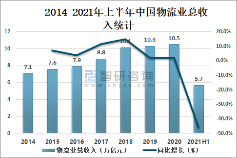 2014-2021年上半年中國物流業(yè)總收入統(tǒng)計