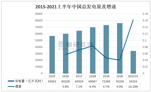 2015-2021上半年中國總發(fā)電量及增速