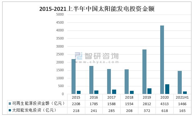 2015-2021上半年中國太陽能發(fā)電投資金額