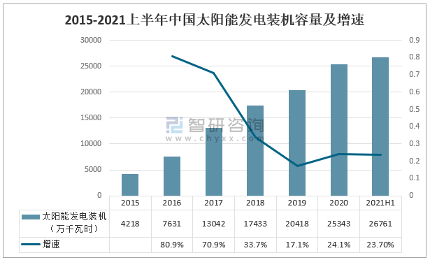 2015-2021上半年中國太陽能發(fā)電裝機(jī)容量及增速
