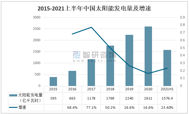 2015-2021上半年中國太陽能發(fā)電量及增速