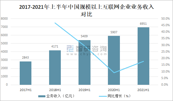 2017-2021年上半年中國規模以上互聯網企業業務收入對比