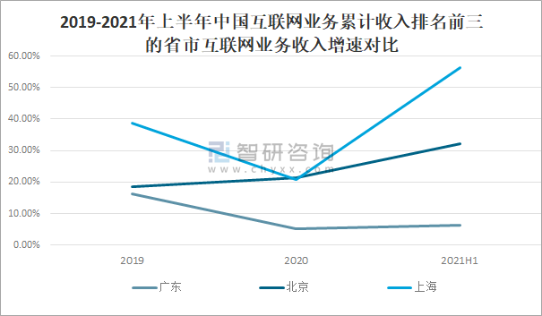 2021年上半年中國互聯網業務累計收入排名前三的省市互聯網業務收入均出現不同程度的增長,2021年上半年廣東互聯網業務收入同比增長6.20%;北京互聯網業務收入同比增長32.10%;上海互聯網業務收入同比增長56.40%。
