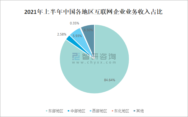 2021年上半年中國東部地區互聯網企業業務收入占全國互聯網企業業務總收入的84.64%,占比非常大;中部地區互聯網企業業務收入占全國互聯網企業業務總收入的2.58%;西部地區互聯網企業業務收入占全國互聯網企業業務總收入的5.93%;東北地區互聯網企業業務收入占全國互聯網企業業務總收入的0.35%。