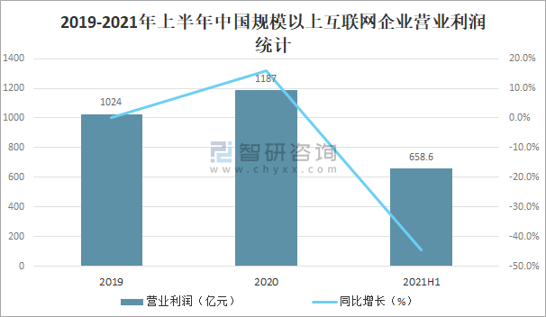 隨著中國規模以上互聯網企業業務收入的增加,營業利潤也隨之增長,2020年中國規模以上互聯網企業營業利潤達1187億元,較2019年增加了163億元,同比增長15.9%,2021年上半年中國規模以上互聯網企業營業利潤已完成658.6億元。