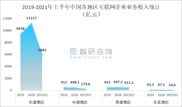 分地區來看,2021年上半年中國東部地區互聯網企業業務收入已完成5883億元;中部地區互聯網企業業務收入已完成179.6億元;西部地區互聯網企業業務收入已完成412.1億元;東北地區互聯網企業業務收入已完成24.6億元。