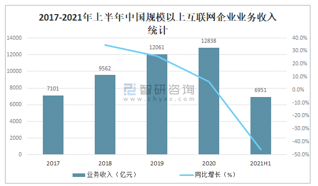 2017-2021年上半年中國規模以上互聯網企業業務收入統計