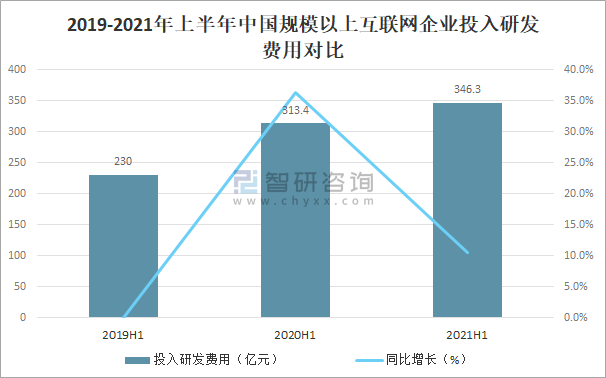 在研發費用方面,近年來互聯網企業投入研發費用逐年增加,2020年中國規模以上互聯網企業投入研發費用達788億元,較2019年增加了253億元,同比增長47.29%,2021年上半年中國規模以上互聯網企業投入研發費用為346.3億元。