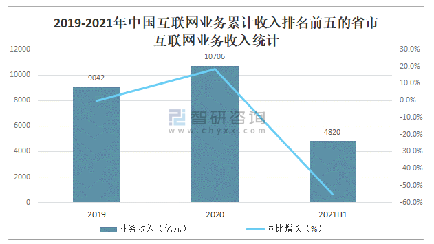 2021年上半年北京、廣東、上海、浙江和福建互聯網業務累計收入居前5名,共完成互聯網業務收入5549億元,同比增長27%。