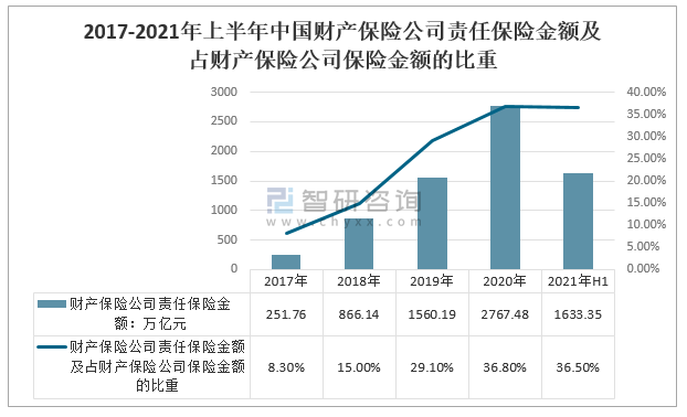 從中國財產保險公司責任保險金額及占財產保險公司保險金額的比重來看,2020年中國財產保險公司責任保險金額2767.48萬億元,占財產保險公司保險金額的36.8%;2021年上半年中國財產保險公司責任保險金額1633.35萬億元,占財產保險公司保險金額的36.5%。