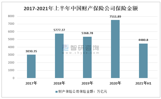 2019年中國財產保險公司保險金額5368.78萬億元,較2018年減少408.59萬億元,同比下降7.1%;2020年中國財產保險公司保險金額7511.89萬億元,較2018年增長2143.11萬億元,同比增長39.9%;2021年上半年中國財產保險公司保險金額為4480.80萬億元。