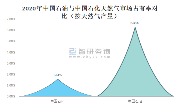 從天然氣市場占有率來看,2020年中國石油天然氣市場占有率明顯高于中國石化,2020年中國天然氣產量為1888.5億立方米,其中中國石化占1.61%,中國石油占6.33%。