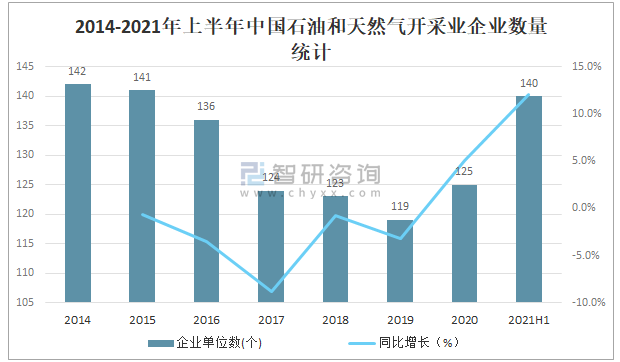 我國油氣資源豐富,石油和天然氣開采業作為能源工業,是我國重要的基礎產業和支柱產業,在國民經濟中具有極其重要的地位,截止2020年末,中國石油和天然氣開采業共有125個企業,較2019年增加了6個,同比增長5.0%,截止2021年上半年,中國石油和天然氣開采業共有140個企業,較2020年底增加了15家。