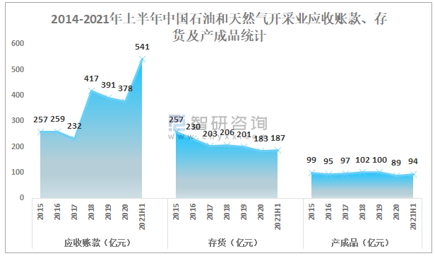 2014-2021年上半年中國石油和天然氣開采業應收賬款、存貨及產成品統計