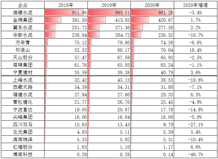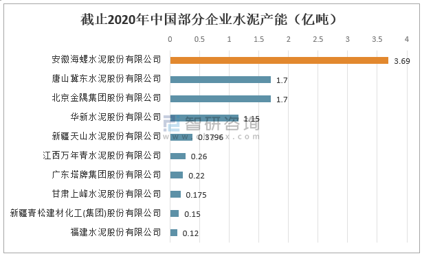 截止2020年,安徽海螺水泥股份有限公司水泥產能為3.69億噸,唐山冀東水泥股份有限公司產能為1.7億噸,北京金隅集團股份有限公司產能為1.7億噸,華新水泥股份有限公司產能為1.15億噸。