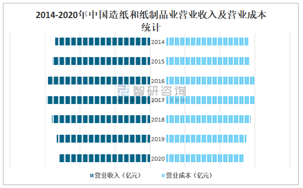 2014-2020年中國造紙和紙制品業(yè)營業(yè)收入及營業(yè)成本統(tǒng)計(jì)