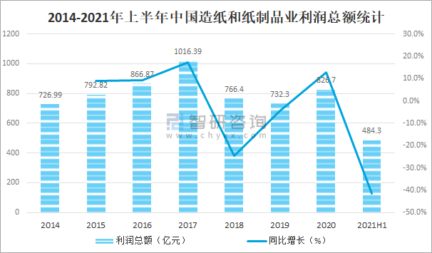 雖然2020年中國造紙和紙制品業(yè)營業(yè)收入有所下滑,但利潤總額且在增加,2020年中國造紙和紙制品業(yè)利潤總額達(dá)826.7億元,較2019年增加了94.40億元,同比增長12.9%,2021年上半年中國造紙和紙制品業(yè)利潤總額已完成484.3億元。