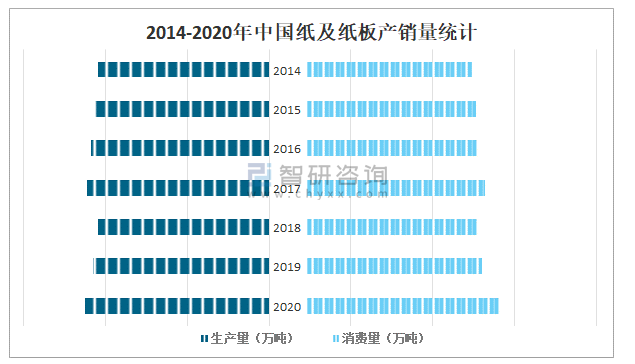 2014-2020年中國紙及紙板產(chǎn)銷量統(tǒng)計(jì)