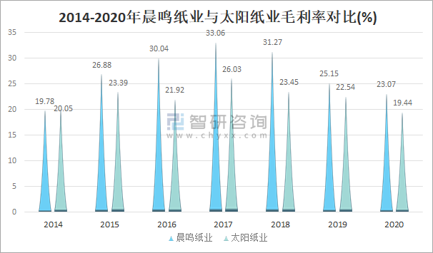 2014-2020年晨鳴紙業(yè)與太陽紙業(yè)毛利率對比(%)