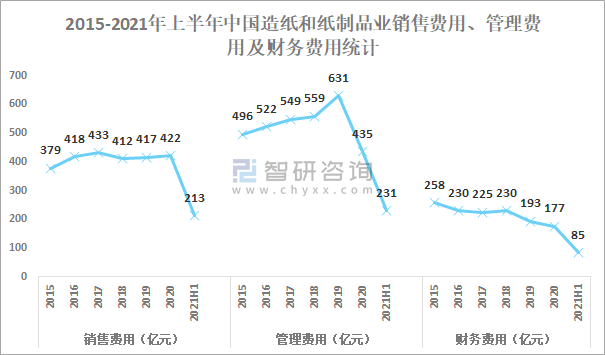 2015-2021年上半年中國造紙和紙制品業(yè)銷售費(fèi)用、管理費(fèi)用及財(cái)務(wù)費(fèi)用統(tǒng)計(jì)