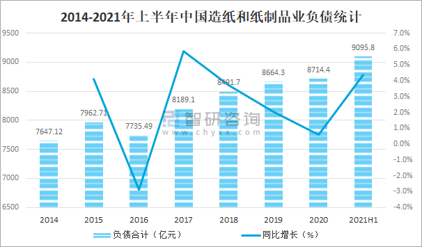 2014-2021年上半年中國造紙和紙制品業(yè)負(fù)債統(tǒng)計(jì)