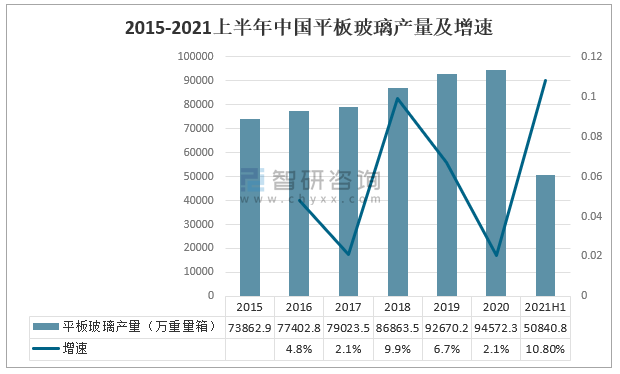 智研咨詢發布的《2021-2027年中國玻璃行業發展現狀調查及市場規模預測報告》數據顯示:平板玻璃也稱白片玻璃或凈片玻璃。 其化學成分一般屬于鈉鈣硅酸鹽玻璃,其中2021上半年中國平板玻璃產量為50840.8萬重量箱,同比增長10.8%。