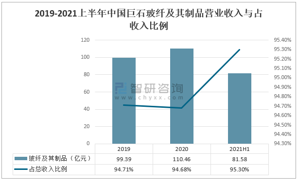 2019-2021上半年中國巨石玻纖及其制品營業收入與占收入比例