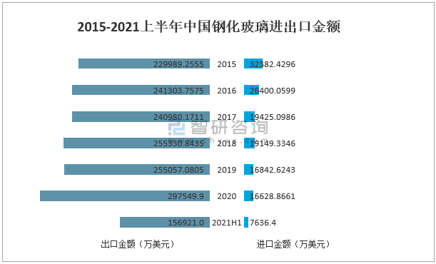 2015-2021上半年中國鋼化玻璃進出口金額