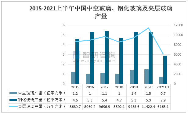 2015-2021上半年中國中空玻璃、鋼化玻璃及夾層玻璃產量