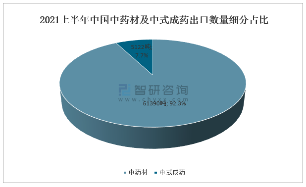 據中國海關數據,2021上半年中國中藥材出口數量為61390噸,占總出口數量的92.3%;上半年中式成藥出口數量為5122噸,占總出口數量的7.7%。