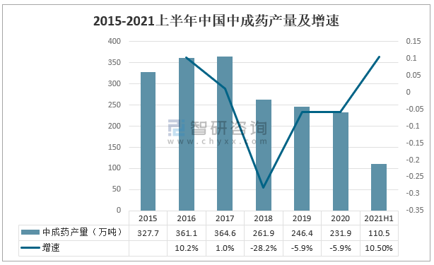 2015-2021上半年中國中成藥產量及增速