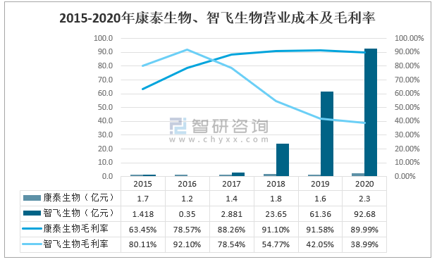 2015-2020年康泰生物、智飛生物營業成本及毛利率