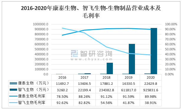2020年康泰生物生物制品營業成本為22639.8萬元,同比增長38.6%,毛利率為89.98%;智飛生物生物制品營業成本為925831.6萬元,同比增長51.3%,毛利率為38.91%。