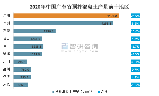 廣東省預拌混凝土產量居全國首位,2020年廣東省預拌混凝土產量前三地區分別為廣州、深圳、東莞,產量分別為4496.0萬m³、4253.8萬m³、1796.4萬m³,較上年分別增長24.9%、3.2%、16.6%。
