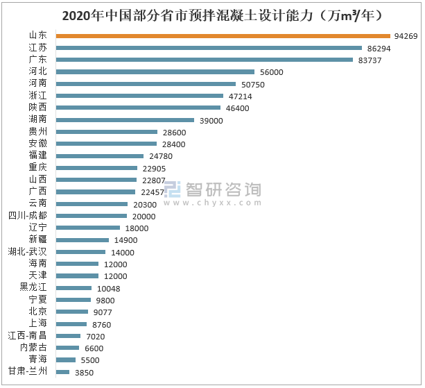 2020年中國預拌混凝土產能有3個省份超過80000萬m³/年,其中山東省預拌混凝土產能居全國榜首,2020年達到94269萬m³/年;其次為江蘇省,產能為86294萬m³/年;廣東省排名第三,產能為83737萬m³/年。