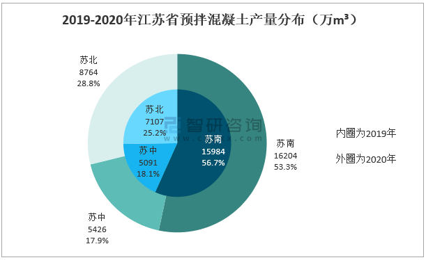 2020年江蘇省產量預拌混凝土產量居全國第四,其中產量集中在蘇南地區,蘇南地區產量為16204萬m³,占江蘇總產量的53.3%;蘇中地區產量為5426萬m³,占比17.9%;蘇北產量為8764萬m³,占比28.8%。