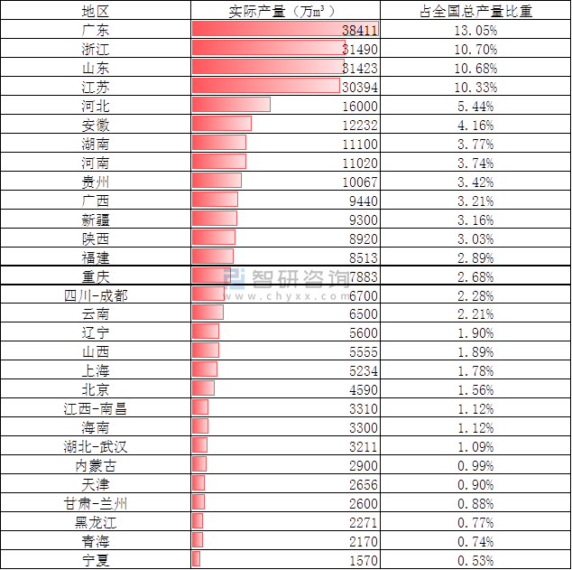 2020年有4個省份中國預拌混凝土產量超過30000萬m³,其中廣東省產量居全國首位,2020年達到38411萬m³,占全國總產量的13.05%;浙江省產量為31490萬m³,占全國總產量的10.70%;山東省產量為31423萬m³,占比10.68%。