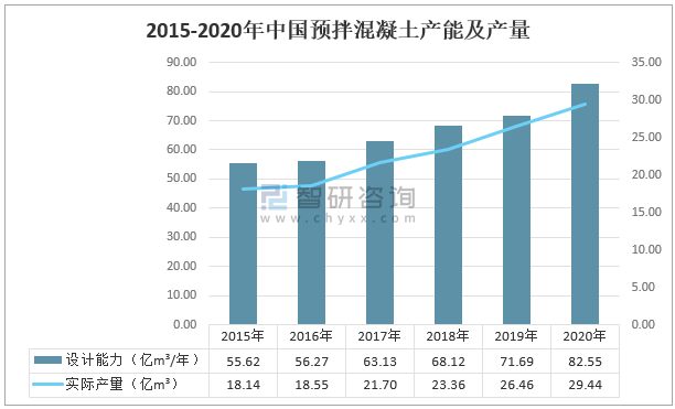 2015-2020年中國預拌混凝土產能及產量
