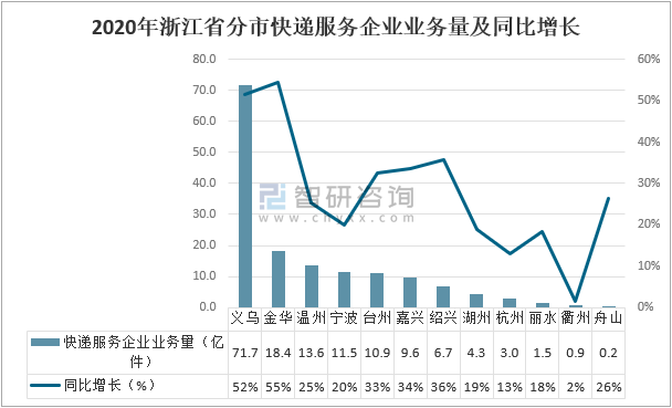 2020年,浙江省快遞業(yè)務(wù)量完成179.46億件,其中,義烏市快遞業(yè)務(wù)量71.7億件,同比增長52%;金華市快遞業(yè)務(wù)量18.4億件,同比增長55%;溫州市快遞業(yè)務(wù)量13.6億件,同比增長25%;寧波市快遞業(yè)務(wù)量11.5億件,同比增長20%;臺(tái)州市快遞業(yè)務(wù)量10.9億件,同比增長33%。