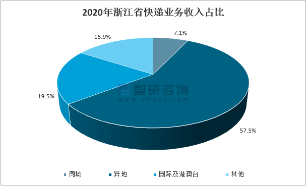 2020年,浙江省同城業(yè)務(wù)收入占快遞總收入的7.1%,與去年同期相比,同城快遞業(yè)務(wù)量的比重上升2.4個(gè)百分點(diǎn);異地業(yè)務(wù)收入占快遞總收入的57.5%,與去年同期相比,異地快遞業(yè)務(wù)量的比重下降2.3個(gè)百分點(diǎn);國際/港澳臺(tái)業(yè)務(wù)收入占快遞總收入的19.5%,與去年同期相比,國際/港澳臺(tái)業(yè)務(wù)量的比重下降0.1個(gè)百分點(diǎn)。