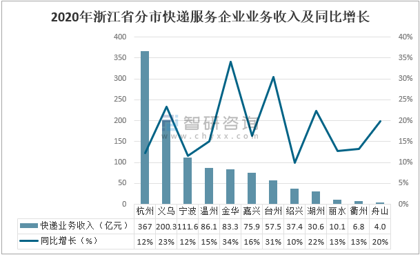 2020年,浙江省快遞業(yè)務(wù)收入完成1070.6億元,其中,杭州市快遞業(yè)務(wù)收入367億元,同比增長12%;義烏市快遞業(yè)務(wù)收入200.3億元,同比增長23%;寧波市快遞業(yè)務(wù)收入111.6億元,同比增長12%;溫州市快遞業(yè)務(wù)收入86.1億元,同比增長15%;金華市快遞業(yè)務(wù)收入83.3億元,同比增長34%。