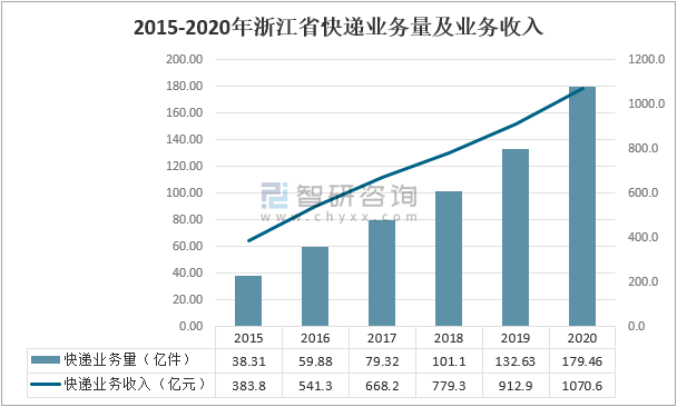 2015-2020年浙江省快遞業(yè)務(wù)量及業(yè)務(wù)收入