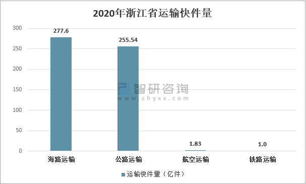 公路運(yùn)輸依然為快遞業(yè)務(wù)主要運(yùn)輸方式,2020年,浙江省通過公路運(yùn)輸快件量為255.54億件,通過航空運(yùn)輸快件量為1.83億件,通過鐵路運(yùn)輸?shù)臑?.0億件,通過海路運(yùn)輸?shù)臑?77.6萬件。