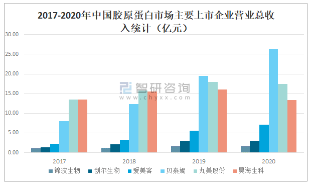 2017-2020年中國膠原蛋白市場主要上市企業營業總收入統計(億元)